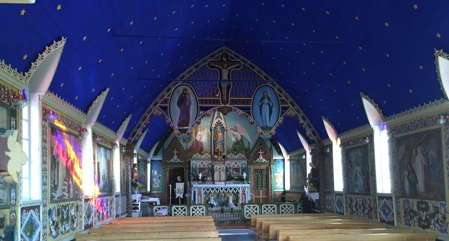 Painting of this church started in 1864 and completed in 1878. Paintings on canvas is conventional oil painting. But the painting that is right on the wood was made all with fish oil paint and local natural colors only. The most amazing part is that it has never been repainted since. It is the oldest church in the North.