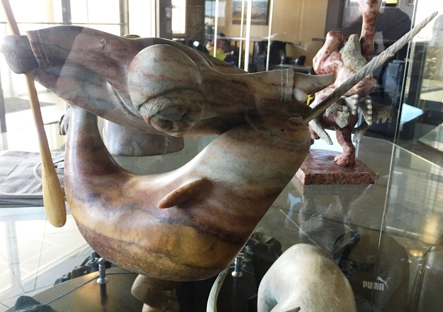 Nahrwahls live in the Arctic Ocean. They are beautiful, rare and protected. But the natives are still allowed to hunt them – but in a traditional way only: spear fishing from their kayaks. Considering the size of Nahrwals, it will be quite a challenge. Our hotel lobby in Inuvik had a beautiful carving of this hunting scene.